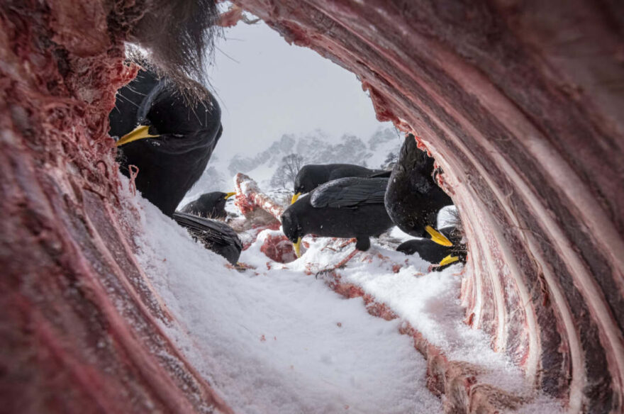«Auf 2500 Metern lag ein toter Steinbock, Blindheit und Hunger zum Opfer gefallen. Zurück blieb ein Echo von Leben und Vergänglichkeit. Fasziniert begann ich ein monatelanges Projekt. Versteckt im Kadaver, mit Geduld und Technik, zeichnete meine Kamera über 4000 Stunden lang ein uraltes Drama auf, ein Bild vom Kreislauf aus Tod, Überleben und Neubeginn.» Philipp Egger.