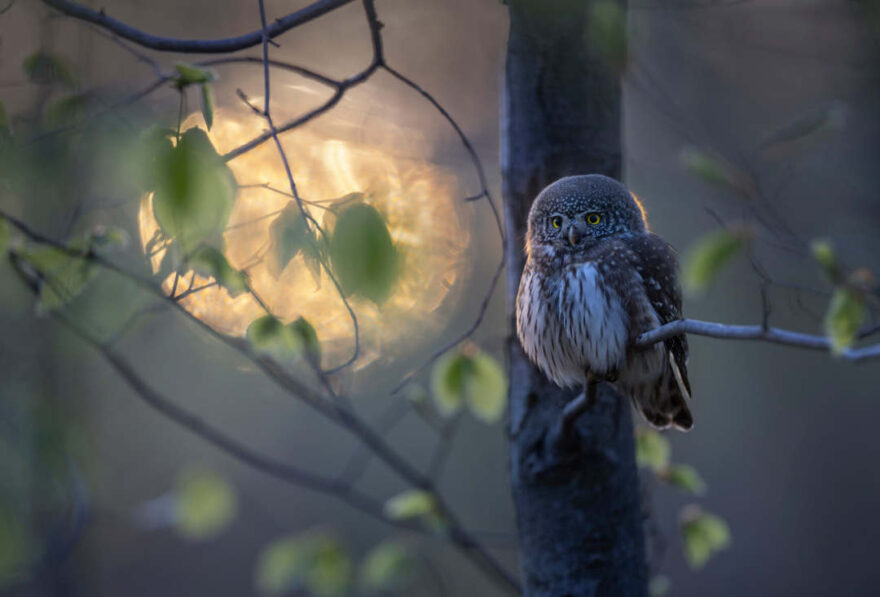 «Obwohl Sperlingskäuze im Harz nicht selten sind, klopft mein Herz bei ihrem unverwechselbaren Ruf jedes Mal schneller. Dieses Männchen sass ungewöhnlich tief und blieb gelassen, während ich mich Schritt für Schritt zur untergehenden Sonne hinbewegte – ein Moment, den ich so für immer festhalten möchte.» Krzysztof Baranowski.