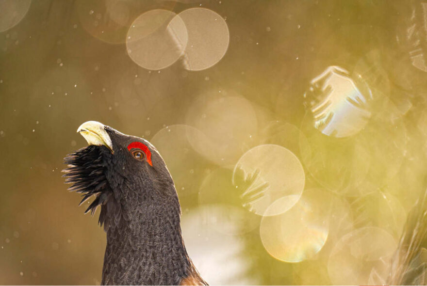 «An einem milden Frühlingsmorgen machte ich mich auf den Weg zu einem abgelegenen Waldstück auf der Suche nach dem beeindruckenden Auerhuhn. Meine Ausrüstung war innen und aussen vom tauenden Wetter angelaufen. Als es nach einer Stunde etwas besserte, fotografierte ich durch einen Baum, der vor Wassertropfen nur so glitzerte, und Bokeh-Effekte entstanden.» Marc Siegle.