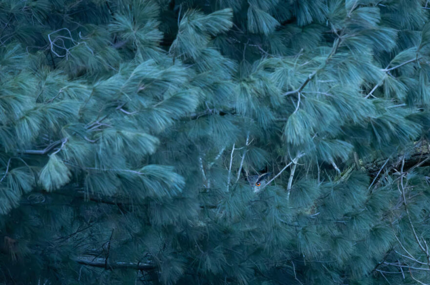 «In einem Waldstück hatte ich zuvor mehrmals ein Uhu-Pärchen beobachtet. An diesem Abend hörte ich das Rufen des Männchens und entdeckte das Paar kurz darauf auf einem Ast. Vorsichtig näherte ich mich und fand schliesslich eine kleine Lücke im Baum, durch die das Auge gut sichtbar wurde.» Julius Kortlepel.