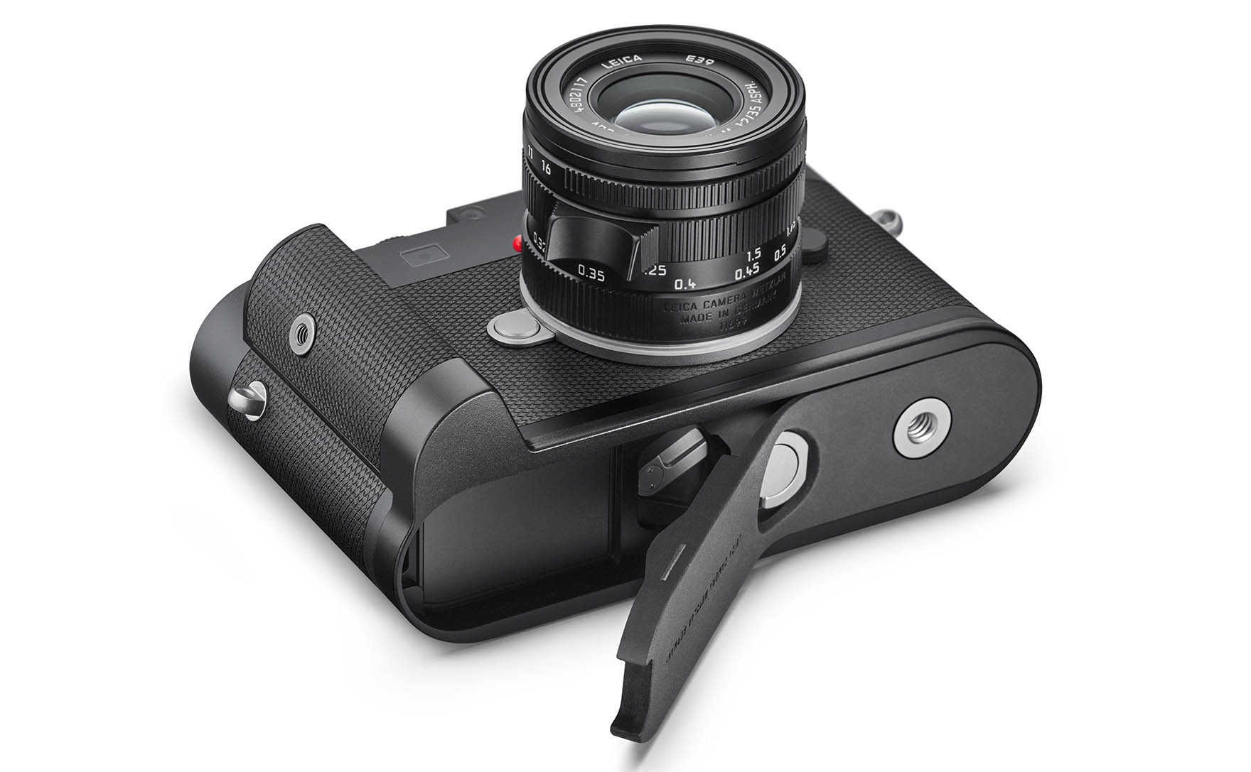 Die Leica M EV1 mit optionalem Handgriff samt passender Belederung (14721) und offenem Akkufach