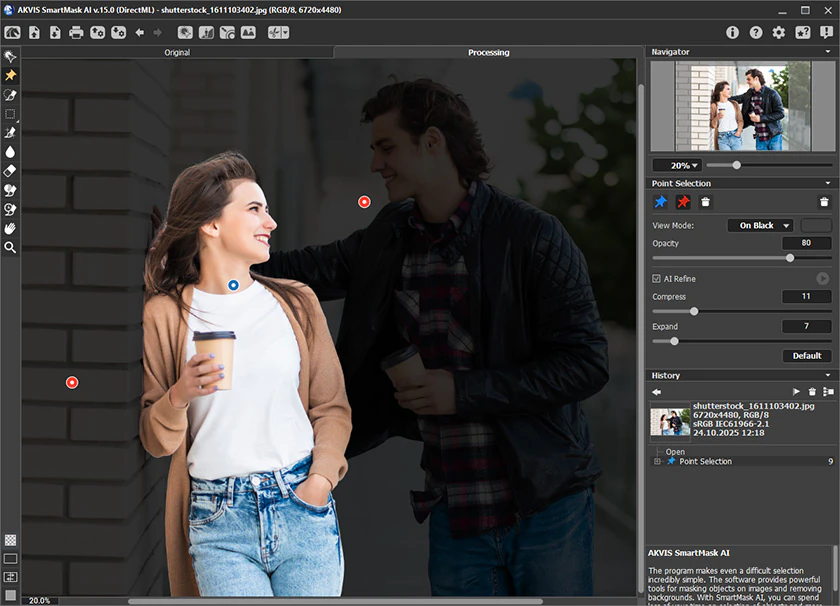 Das innovative KI-basierte Punktauswahl-Werkzeug wird von einer hochentwickelten neuronalen Netzwerk-Technologie angetrieben und ermöglicht dieses Werkzeug eine blitzschnelle und präzise Auswahl ganzer Objekte oder ihrer spezifischen Teile – und das mit nur wenigen Klicks. Nutzende markieren einfach den gewünschten Bereich, und der clevere Algorithmus übernimmt den Rest.