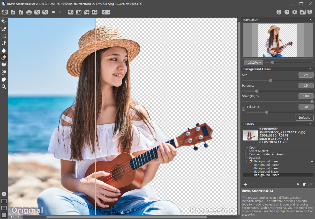 SmartMask ist eine fortschrittliche Software zur Objektauswahl, die den Bildbearbeitungs-Workflow deutlich vereinfacht. Komplexe Objekte wie Porträts mit Locken werden in Sekunden freigestellt. Mit dem Tool lassen sich Objekte mit scharfen als auch weichen Kanten schnell und mühelos extrahieren. Die Software entfernt nicht nur den Hintergrund, sondern sorgt auch dafür, dass keine störenden Farbtöne des ursprünglichen Hintergrunds auf dem freigestellten Objekt zurückbleiben. So wird stets ein professionelles Ergebnis erzielt. Durch den Einsatz modernster KI-Technologien bietet SmartMask eine Vielzahl intelligenter Tools und Funktionen, mit denen selbst anspruchsvollste Objekte exakt freigestellt und Hintergründe mühelos entfernt werden können.