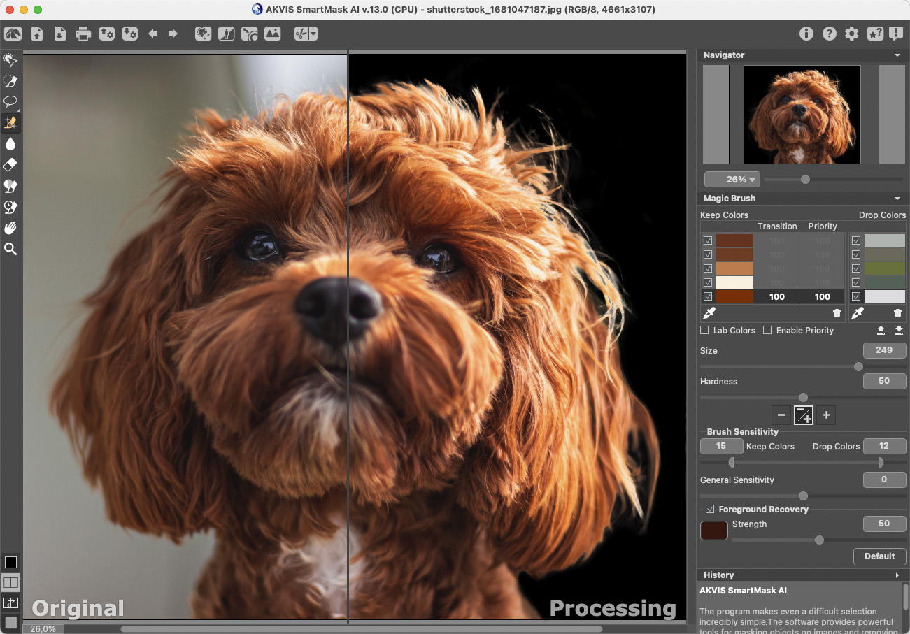 Die als Plug-in und Standalone-Anwendung verfügbare Software gehört schon lange zum Sortiment von Akvis, das aus vielen Programmen mit spezieller Funktionen besteht, während andere Software-Hersteller statt vieler kleinen Software-Tools solche Funktionen in einem Programm anbieten. SmartMask wird seit einigen Versionen mit AI/KI-unterstützt und ist jetzt in Version 15 angekommen.