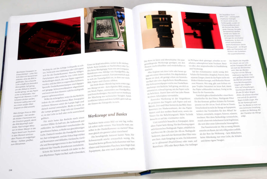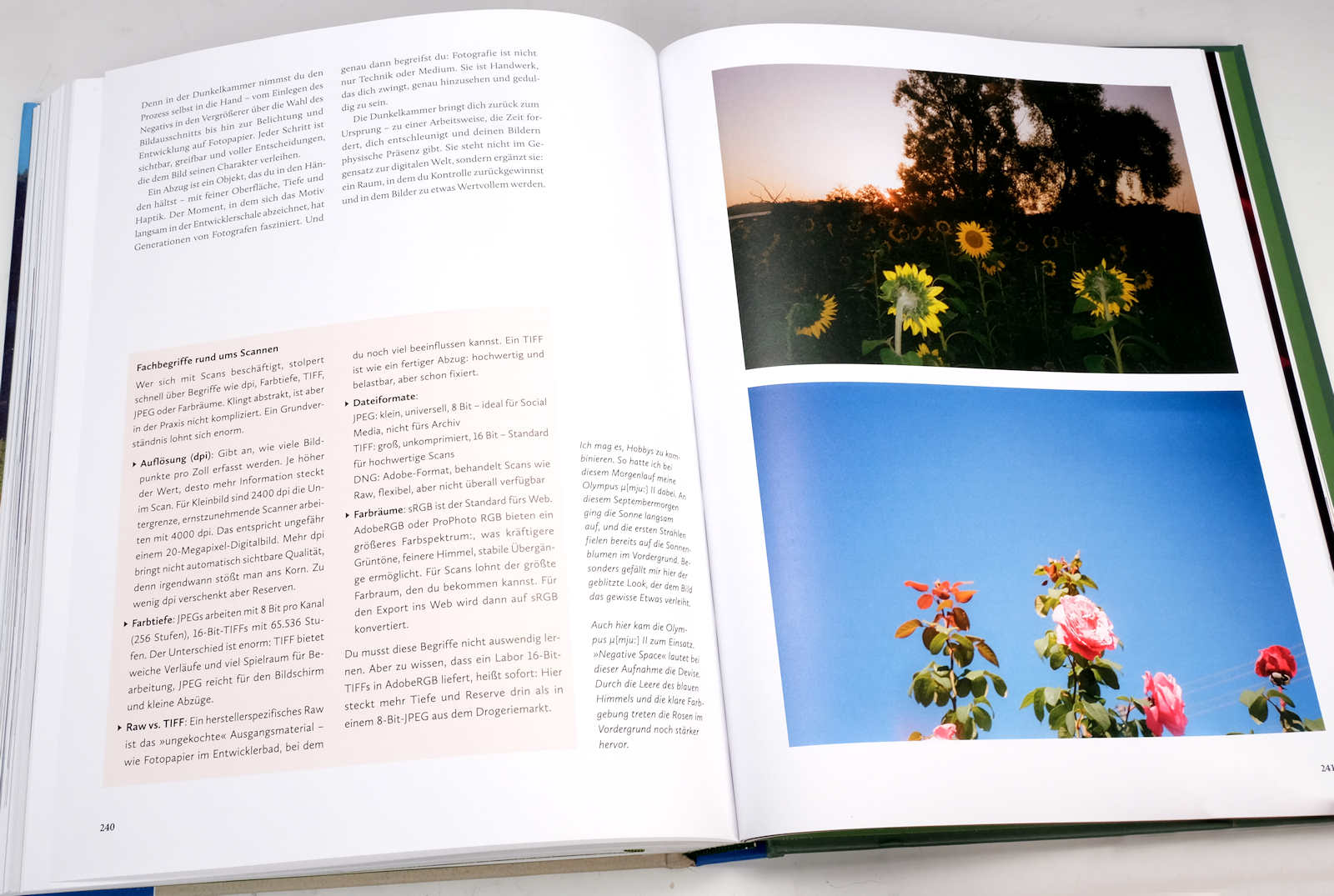 Und doch kommt das Buch über analoge Fotografie nicht ganz ohne Digitaltechnik aus. Florian hat wohlüberlegt ein Kapitel über das Digitalisieren von Negativen und Dias eingefügt, einmal um mit den Digitalisaten die Originale zu schonen, weil jedes Herausnehmen eines Negativs oder Dias Spuren durch Staub und mechanische Einflüsse zur Folge hat. Dann aber auch, weil die digitale Weiterverarbeitung viele Möglichkeiten bietet, um das Bild zu verbessern, zu verändern und letztlich mit modernen Mitteln auszuprinten. Hybride Fotografie ist hierfür der Fachbegriff. Dennoch lässt der erfahrene Autor das Kapitel über die Labortechnik nicht aus, über das Filmentwickeln und das Erstellen von analogen Papierbildern.