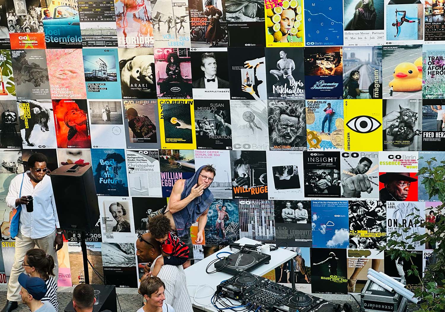 Plakate vergangene Fotoausstellungen des c/o Berlin im Innenhof des Amerikahauses bei der 25-Jahr-Feier im Juni 2025.